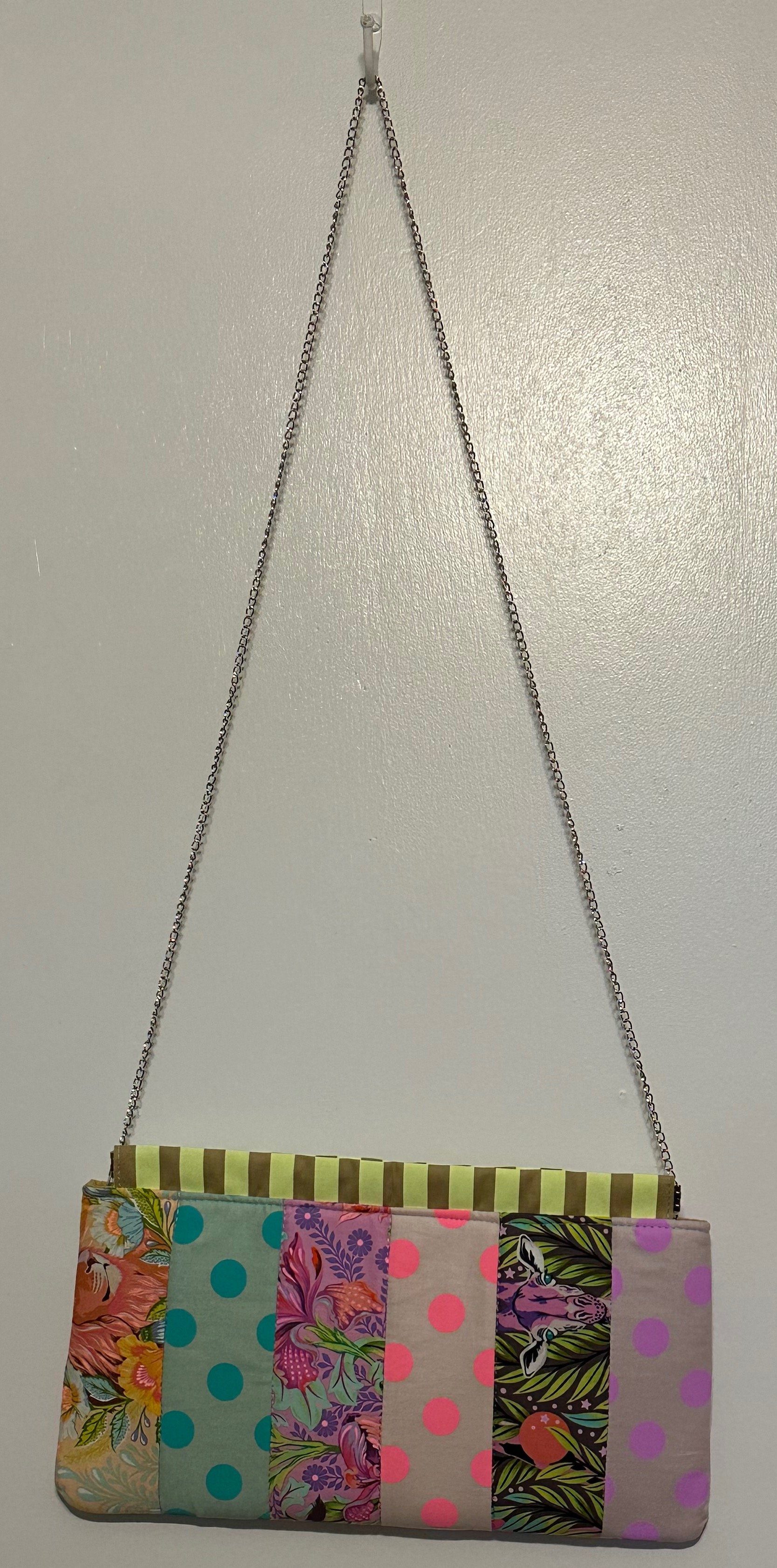 What an adorable clutch! It includes a metal chain strap and it features a slip interior pocket. Measurements are 13.5 inches long by 7.5 inches tall.