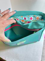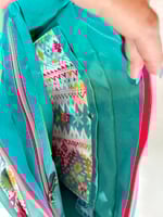 Summertime colors with expandable strap. Front pocket is large and roomy. Hidden back zipper pocket. Cell phone pocket. Inside: zipper pocket and 2 slip pockets. LOTS of storage with this bag!