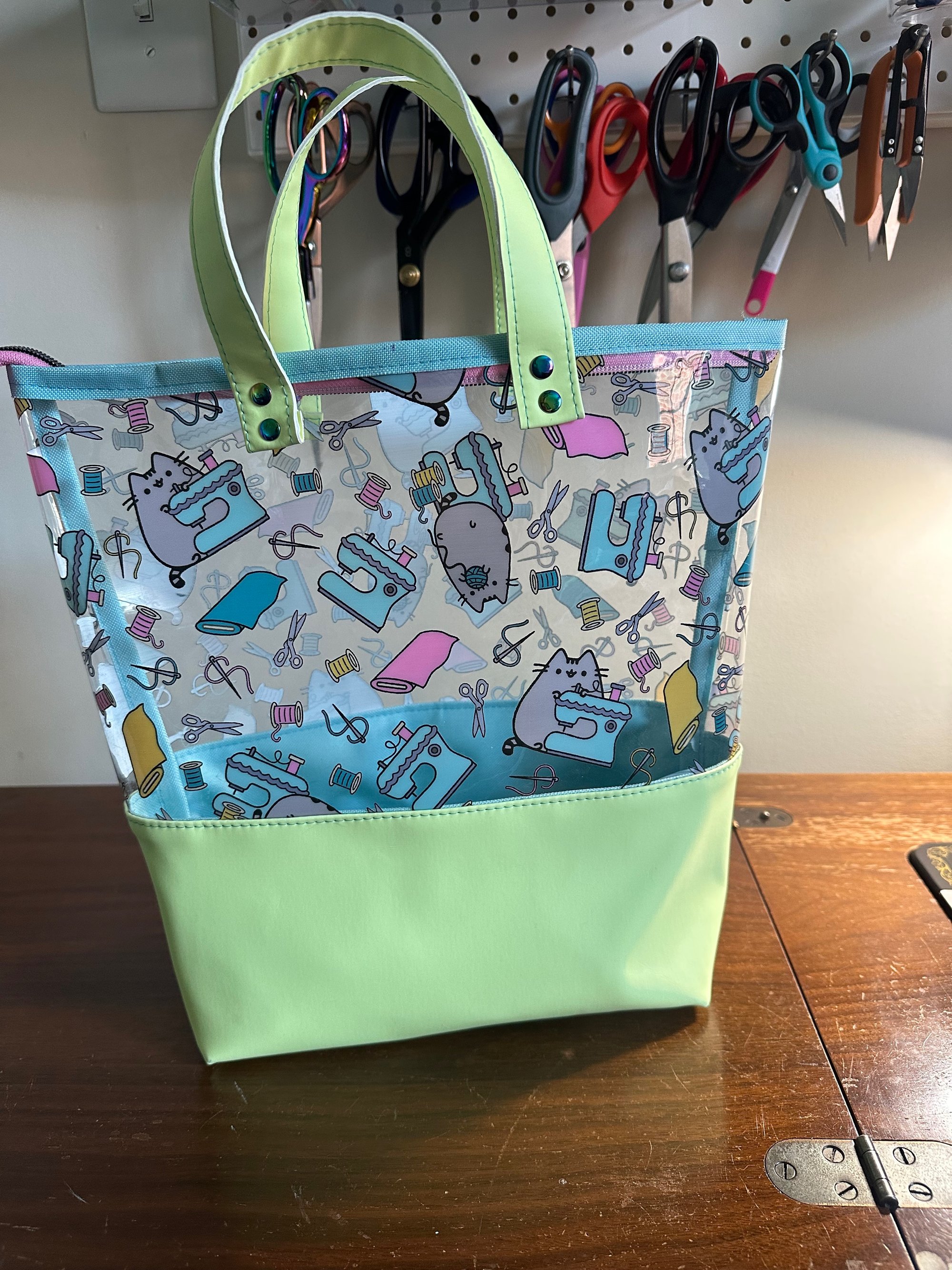 This zippered see-through tote features a waterproof interior lining, see-through top exterior, and a glow in the dark exterior bottom vinyl. Measures 12 inches high, 9.5 inches wide, and 3.5 inches deep. Do not put in washing machine, wipe out/off with clean wet rag.
